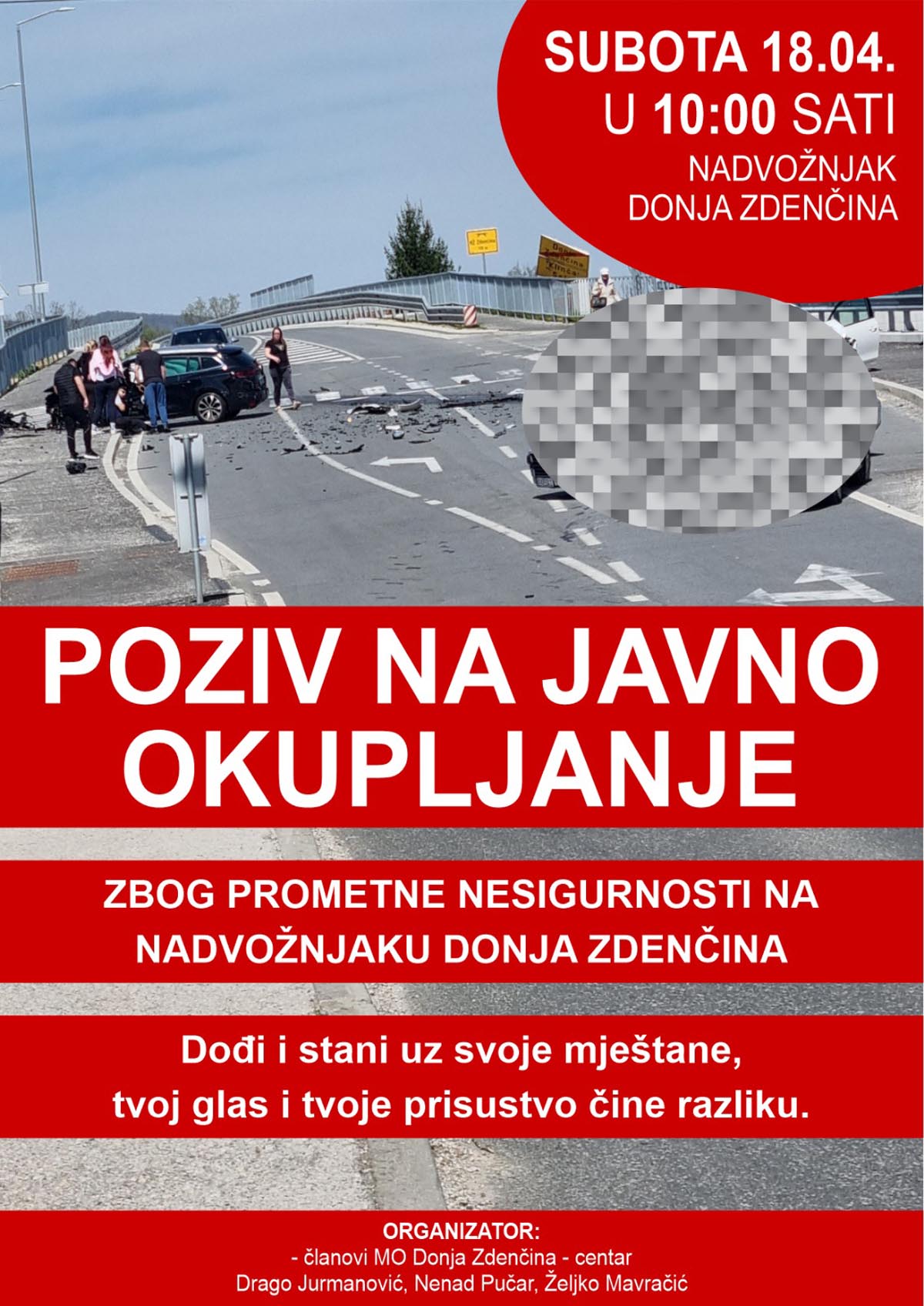 Na nadvožnjaku u Donjoj Zdenčini u subotu, 18. travnja, održat će se mirno okupljanje kojem je svrha ukazati na problem prometne sigurnosti nadvožnjaka koji se godinama ne rješava. Javni skup organiziraju članovi Mjesnog odbora Donja Zdenčina – centar, Drago Jurmanović, Nenad Pučar i Željko Mavračić.