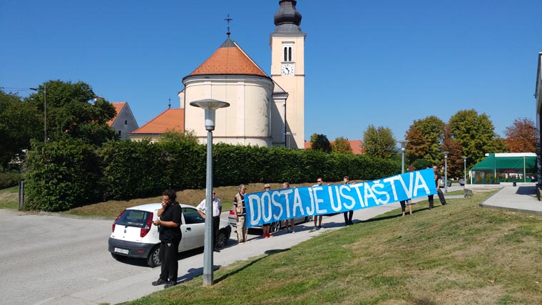 Tribina u Jastrebarskom izazvala je i manji prosvjed. Od strane pripadnika Radničke fronte i Nove ljevice nazvana je klerofašističkim izvrtanjem povijesti pa je u vrijeme njena održavanja na Trgu bl. Alojzija Stepinca u Jastrebarskom održan protestni skup na kojem su okupljeni izvjesili transparent s natpisom "Dosta je ustaštva!"