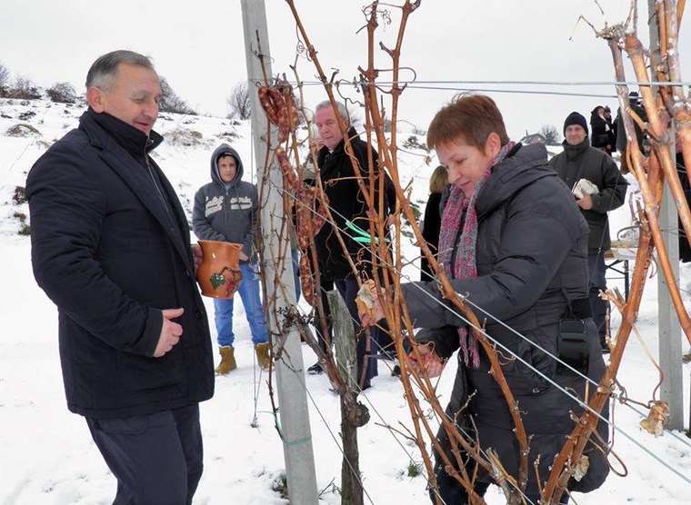 Goste je pozdravila i upoznala s domaćinima predsjednica udruge Dubravka Horvat Uzelac. Nakon toga je vinograd blagoslovio svetojanski župnik Josip Gonan, a prvu rezidbu kao što i priliči odradila je domaćica gospođa Vesnica Ivčec uz pomoć zamjenika gradonačelnika Jastrebarskog Stipu Bučara.
