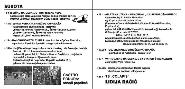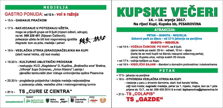 U tri dana vikenda uz Kupu očekuje vas zabavni program; vožnja čamcem po Kupi, vožnja kočijom uz Kupu, sajam domaćih proizvoda, tradicionalna veslačka utrka, natjecanje u starim igrama, sportska, kulturna i gastro događanja, umjetnički program te koncerti estradnih zvijezda.