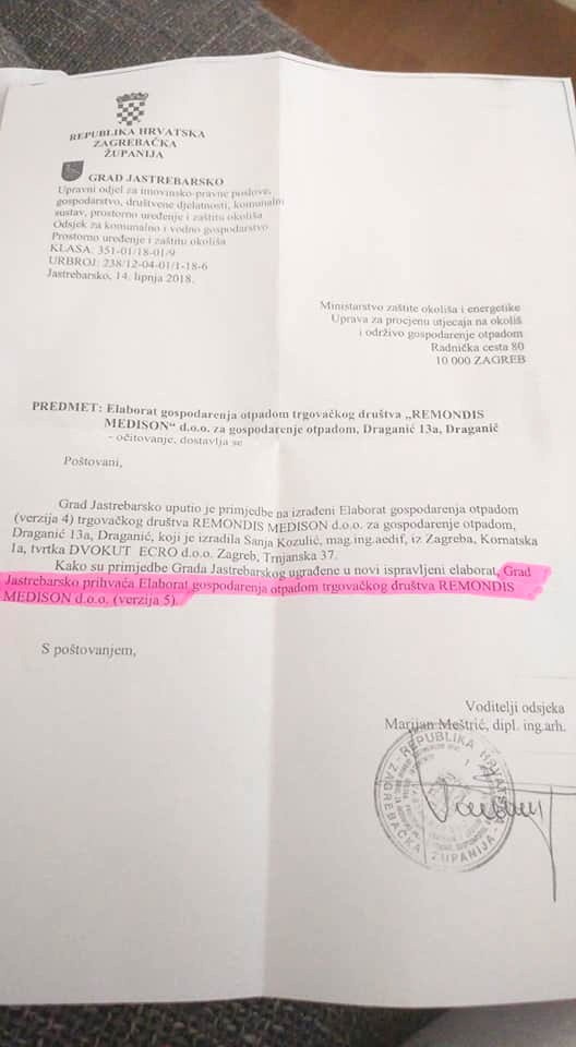 Ono što je u javnost procurilo jest i dokument koji pokazuje da je Grad Jastrebarsko dao zeleno svijetlo Elaboratu gospodarenja otpadom tvrtke Remondis Medison u lipnju ove godine (nakon uvrštenih primjedbi koje je uložio), a sada u javnosti istupa kao oštar protivnik cijelom projektu i kaže kako ta tvrtka u gradu nije poželjna.