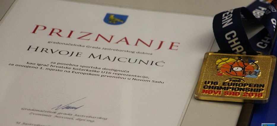 Povodom senzacionalnog rezultata kadetske hrvatske košarkaške reprezentacije, osvajanja zlata na nedavnom Europskom U-16 prvenstvu održanom u Novom Sadu, reprezentativca iz Jastrebarskog Hrvoja Majcunića priznanjem je nagradilo i Gradsko vodstvo.